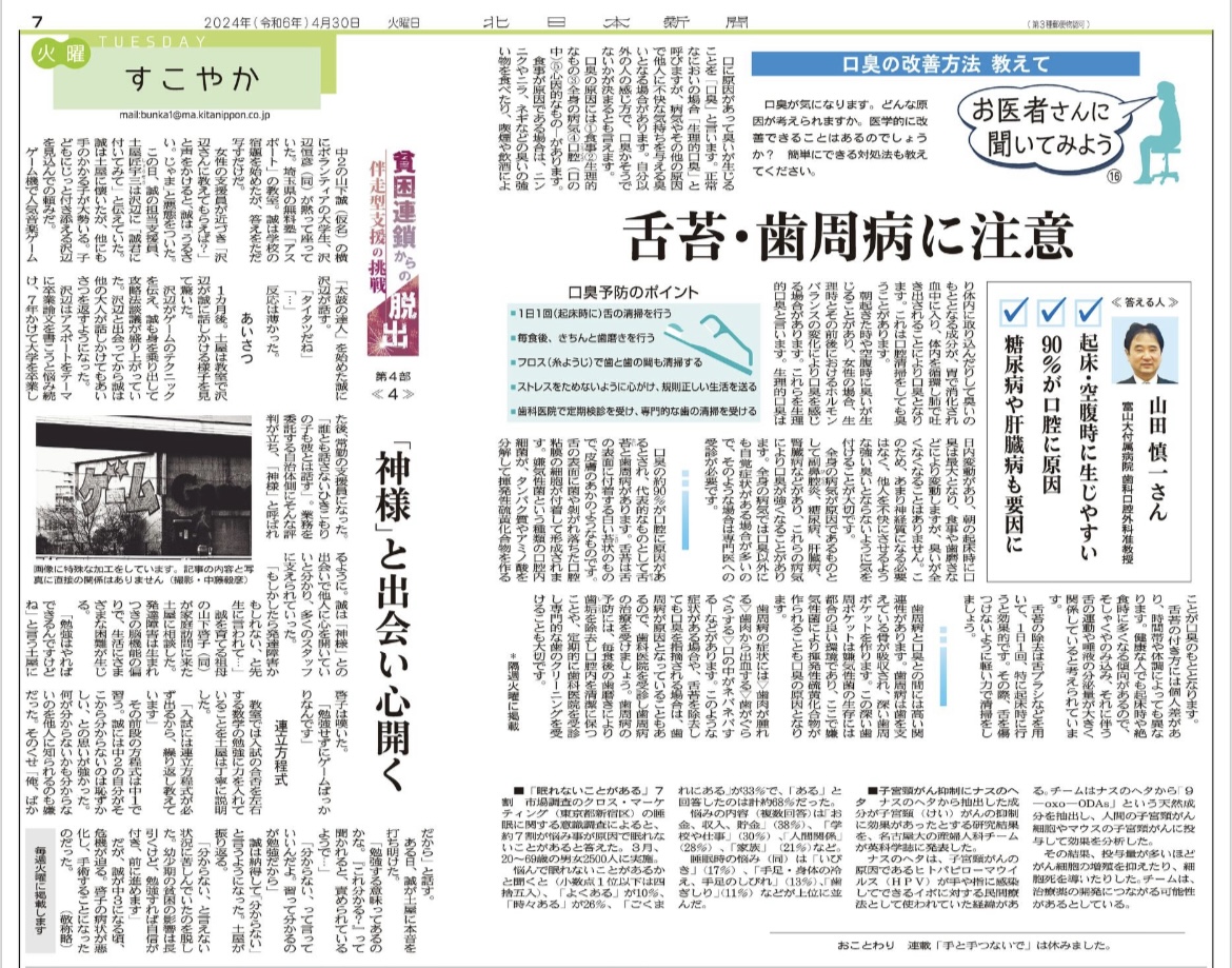2024年4月30日の北日本新聞の「お医者さんに聞いてみよう」のコーナーにて、山田慎一先生が執筆された「口臭」に関する記事が掲載されました。口臭の原因や歯周病との関連,口臭予防のポイント等が、分かりやすく記載してあります。