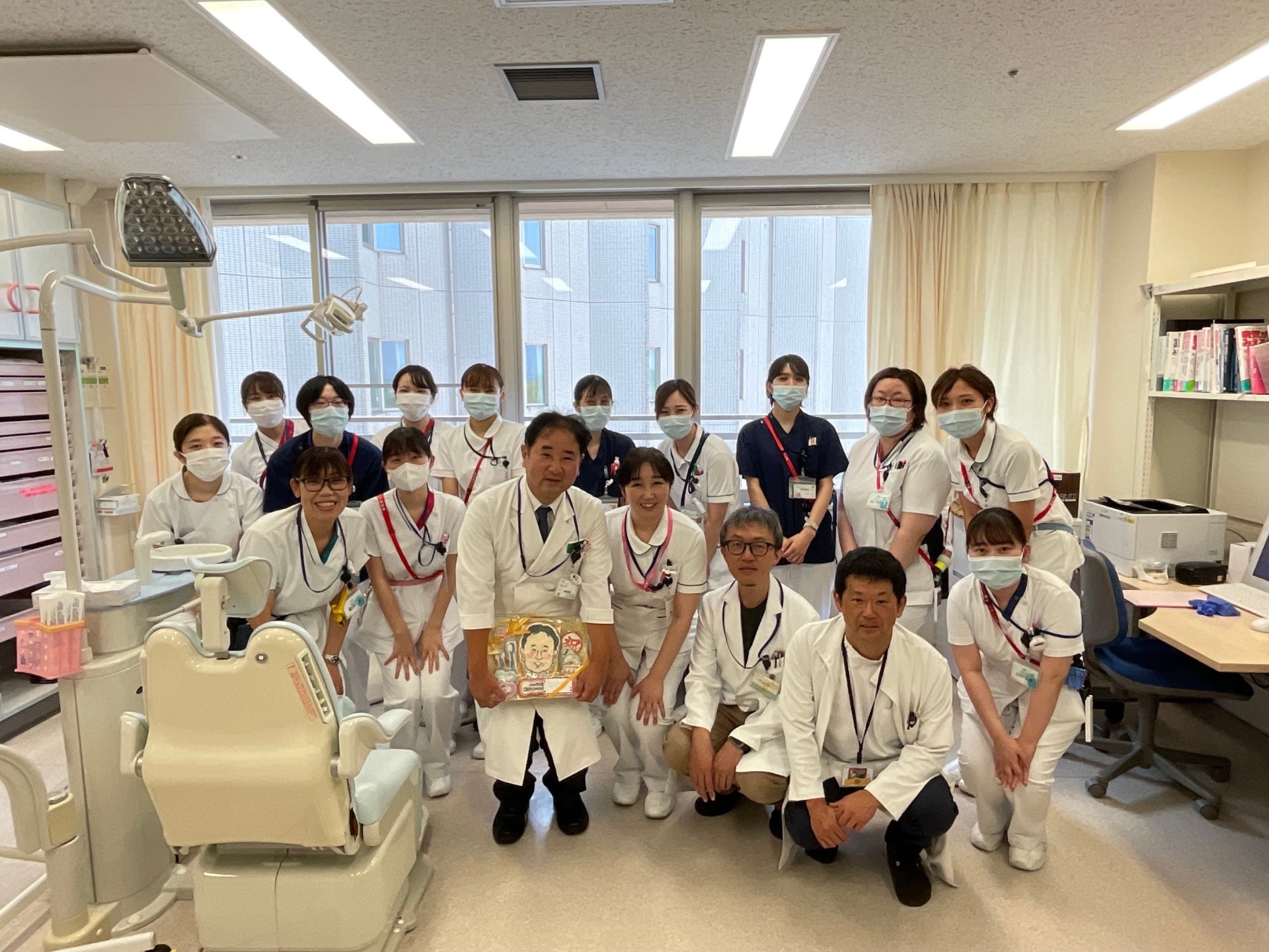 口腔外科の病棟看護師さんから、山田慎一先生の教授就任のお祝いをして頂きました。とても完成度が高い山田先生の似顔絵のクッキーを頂きましたが、なんと手作りだそうです!医局員一同心より感謝致します。