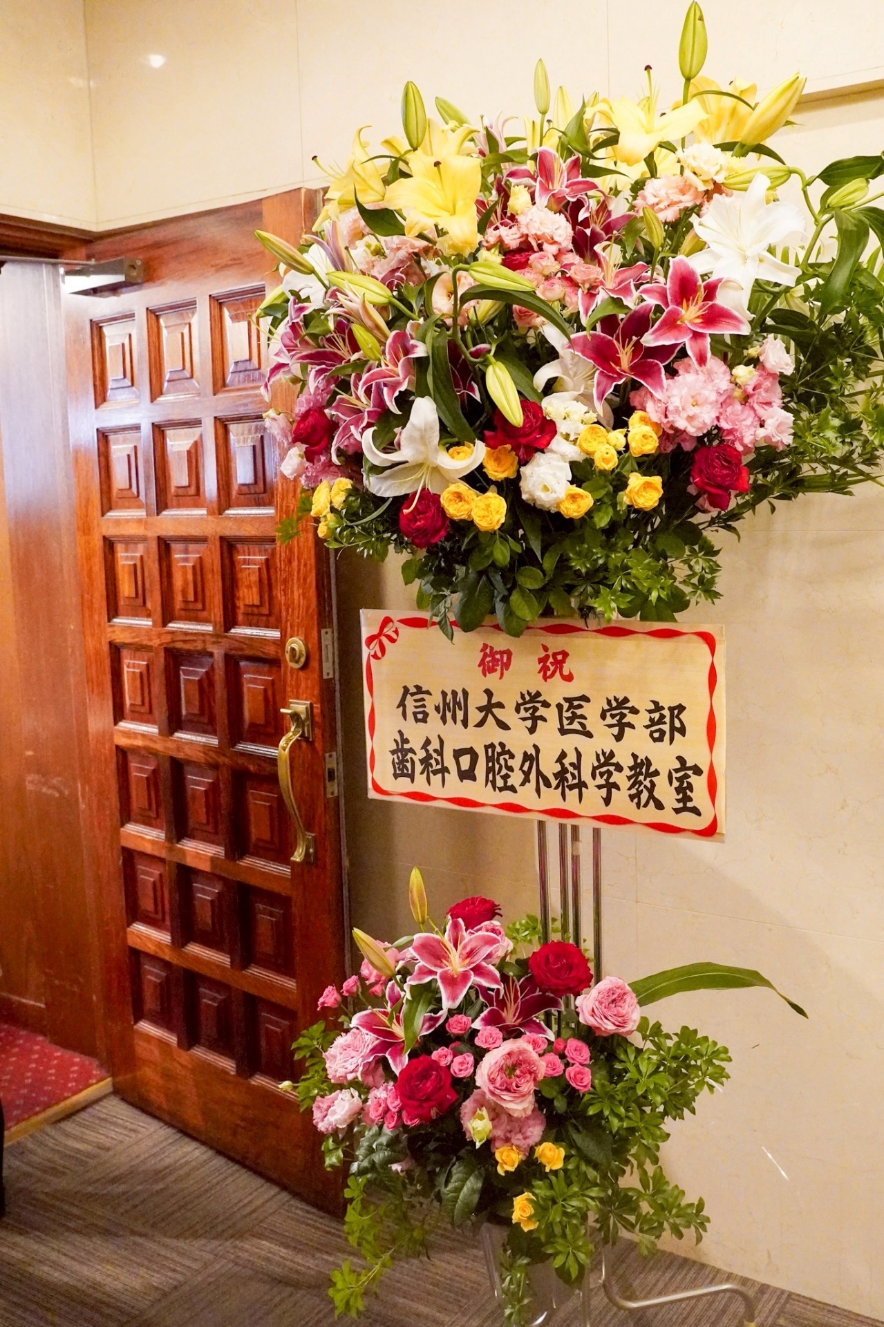 (掲載写真:各先生方のご挨拶/乾杯の様子/受付風景/祝花)