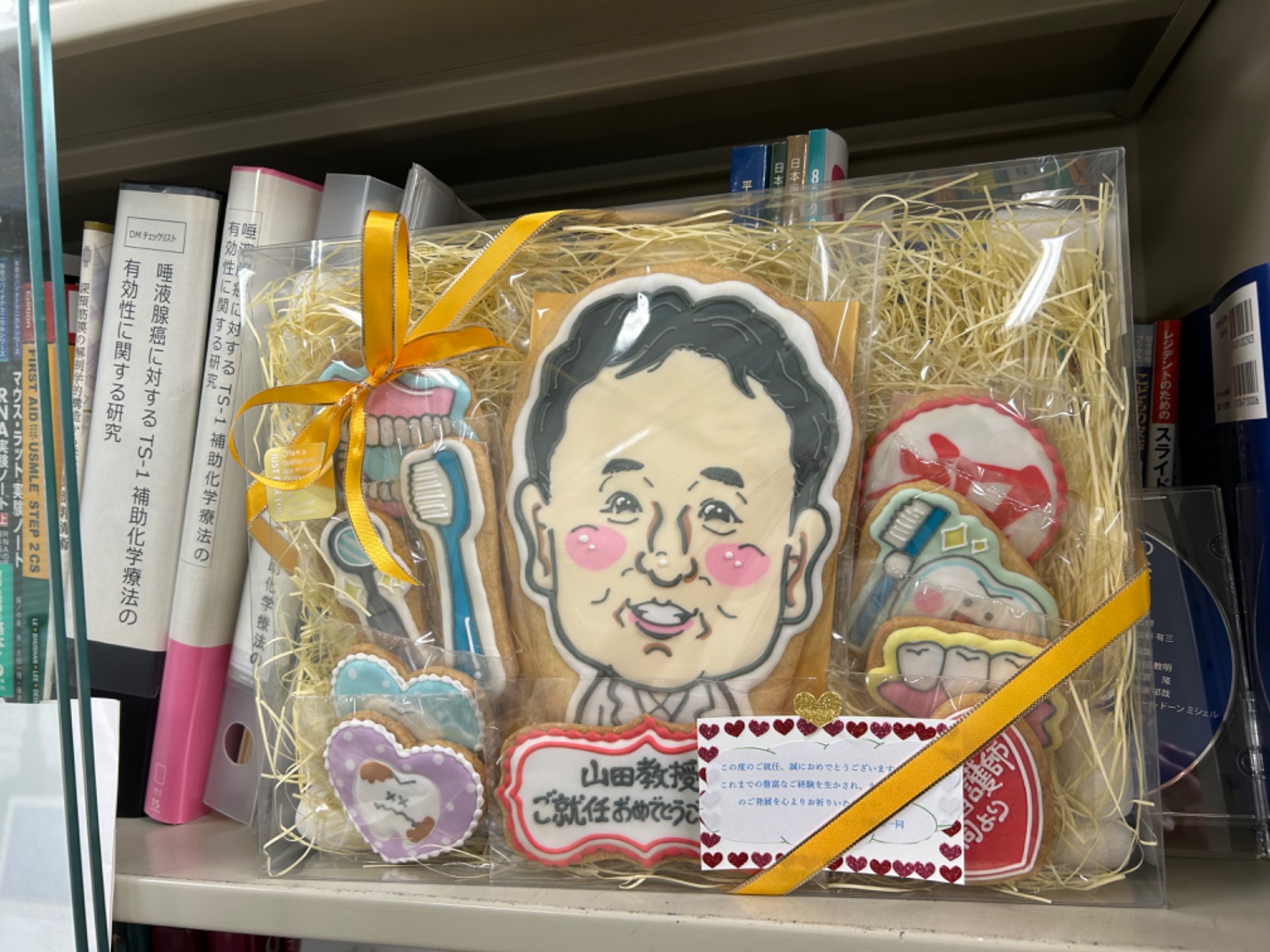 口腔外科の病棟看護師さんから、山田慎一先生の教授就任のお祝いをして頂きました。とても完成度が高い山田先生の似顔絵のクッキーを頂きましたが、なんと手作りだそうです!医局員一同心より感謝致します。