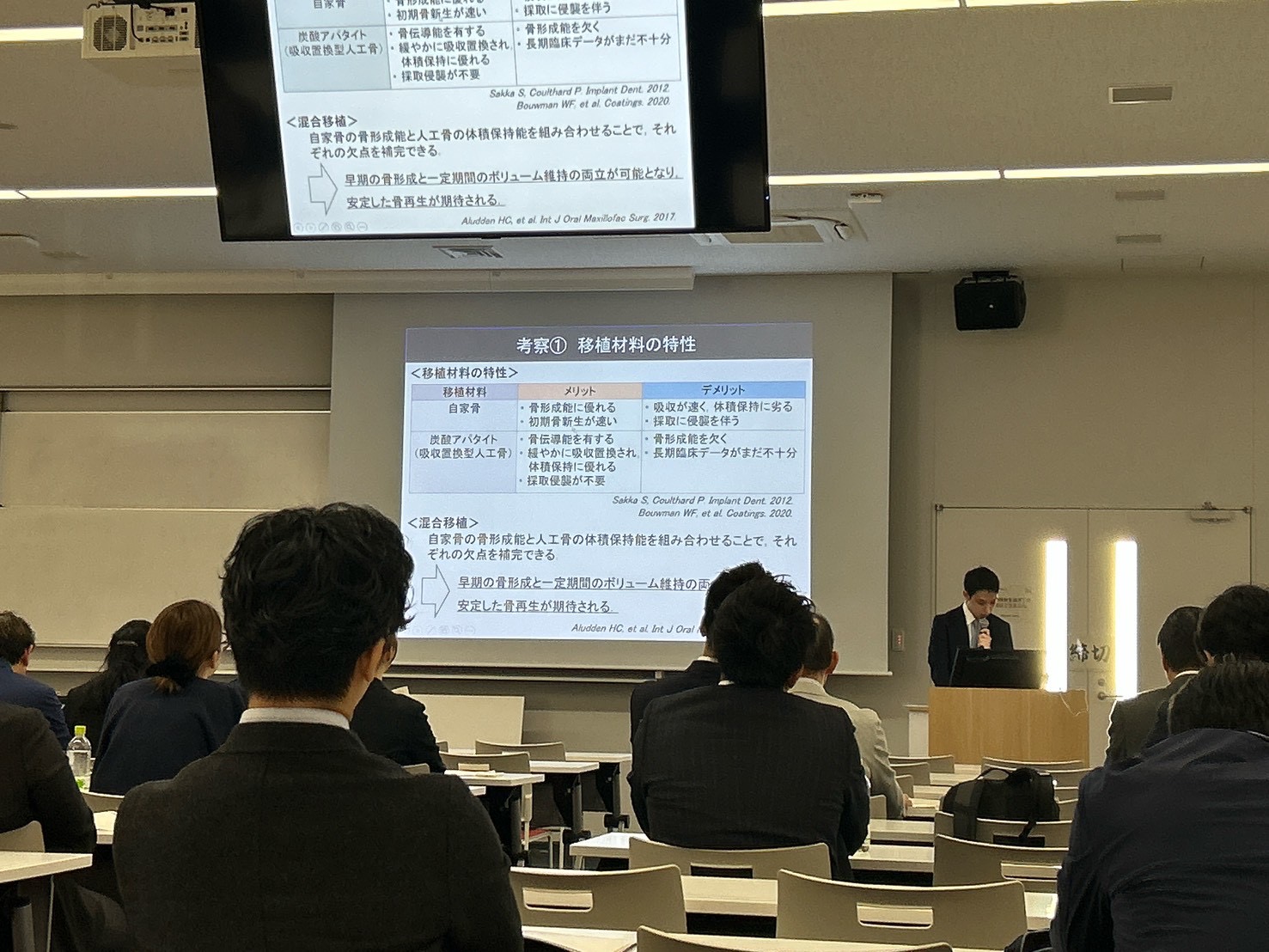 11月3日(月)の一般口演セッションにおいて、高塚先生が「胃全摘術後高齢患者に対し自家骨と吸収置換型人工骨を併用して上顎洞底挙上術を行った1例」を発表しました。