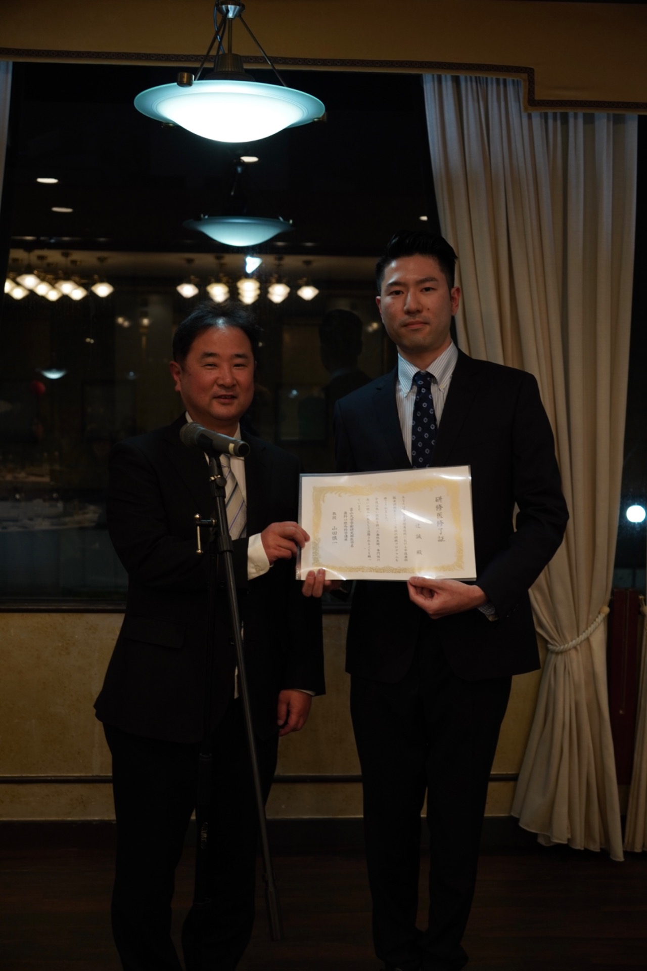 また当日は、辻誠先生の研修修了式も行われ、山田教授より研修修了証が授与されました。辻先生は来年度より当講座の大学院生として、臨床と研究の両面でさらに研鑽を積んでいく予定です。